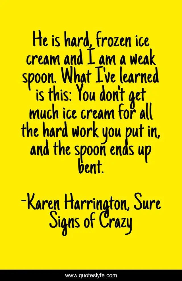 This page presents the quote "He is hard, frozen ice cream and I am a weak spoon. What I've learned is this: You don't get much ice cream for all the hard work you put in, and the spoon ends up bent.". Author of this quote is Karen Harrington, Sure Signs of Crazy. .
