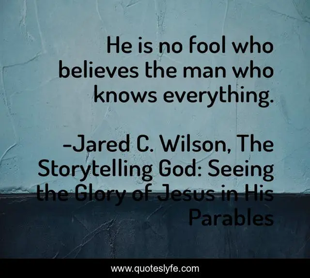 This page presents the quote "He is no fool who believes the man who knows everything.". Author of this quote is Jared C. Wilson, The Storytelling God: Seeing the Glory of Jesus in His Parables. This quote is about christianity, jesus,.