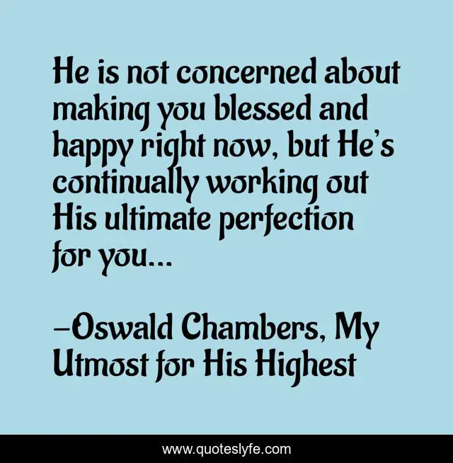 This page presents the quote "He is not concerned about making you blessed and happy right now, but He’s continually working out His ultimate perfection for you...". Author of this quote is Oswald Chambers, My Utmost for His Highest. .
