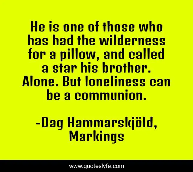 This page presents the quote "He is one of those who has had the wilderness for a pillow, and called a star his brother. Alone. But loneliness can be a communion.". Author of this quote is Dag Hammarskjöld, Markings. This quote is about transcendence, path, integrity, nature,.