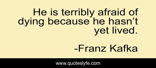 This page presents the quote "He is terribly afraid of dying because he hasn’t yet lived.". Author of this quote is Franz Kafka. This quote is about life, death, dying, kafka, franz, fear,.