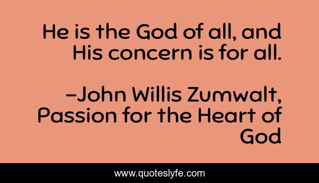 This page presents the quote "He is the God of all, and His concern is for all.". Author of this quote is John Willis Zumwalt, Passion for the Heart of God. This quote is about character-of-god, justice, love, missionary, affection,.