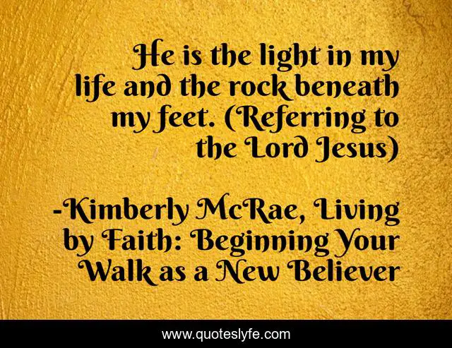 This page presents the quote "He is the light in my life and the rock beneath my feet. (Referring to the Lord Jesus)". Author of this quote is Kimberly McRae, Living by Faith: Beginning Your Walk as a New Believer. This quote is about faith, inspirational, enthusiasm,.