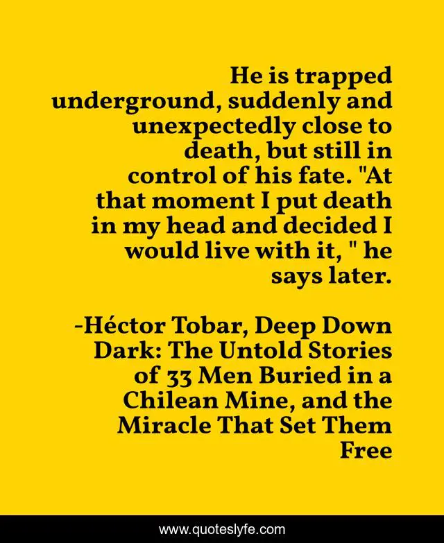 "Héctor Tobar, Deep Down Dark: The Untold Stories of 33 Men Buried in a Chilean Mine, and the Miracle That Set Them Free Quotes." Quoteslyfe.com, 2025. Mon. 08 Dec. 2025. <https://www.quoteslyfe.com/quote/He-is-trapped-underground-suddenly-and-unexpectedly-153708>.