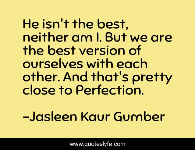 This page presents the quote "He isn't the best, neither am I. But we are the best version of ourselves with each other. And that's pretty close to Perfection.". Author of this quote is Jasleen Kaur Gumber. This quote is about life, lovers, love, couple, good, marriage, perfection, love-story, affection,.