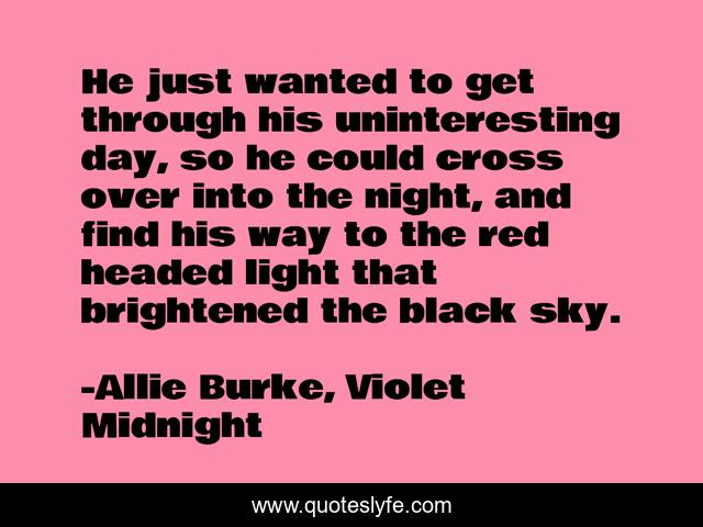 This page presents the quote "He just wanted to get through his uninteresting day, so he could cross over into the night, and find his way to the red headed light that brightened the black sky.". Author of this quote is Allie Burke, Violet Midnight. .