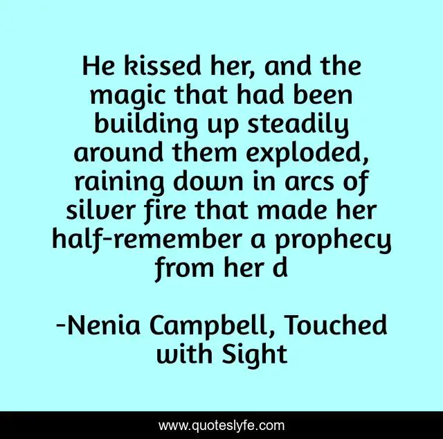 This page presents the quote "He kissed her, and the magic that had been building up steadily around them exploded, raining down in arcs of silver fire that made her half-remember a prophecy from her d". Author of this quote is Nenia Campbell, Touched with Sight. This quote is about magic, love, paranormal, dark, fantasy, kiss, kissing, prophecy, paranormal-romance,.