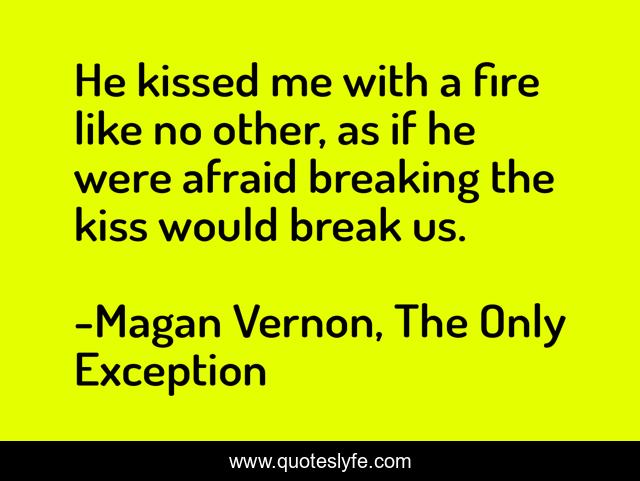This page presents the quote "He kissed me with a fire like no other, as if he were afraid breaking the kiss would break us.". Author of this quote is Magan Vernon, The Only Exception. This quote is about new-adult, the-only-exception,.
