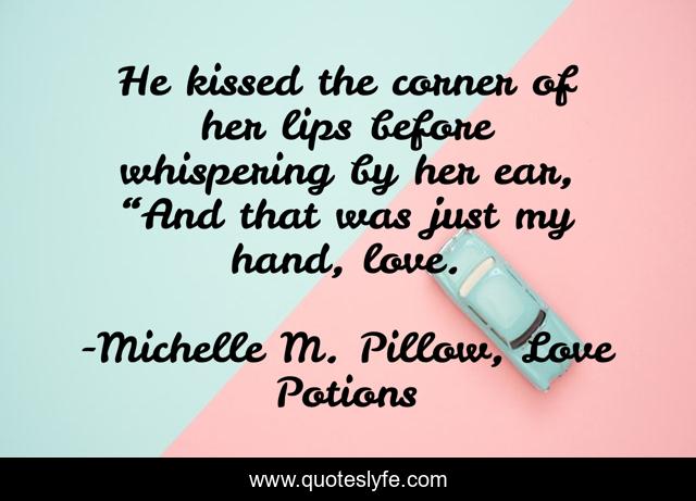 This page presents the quote "He kissed the corner of her lips before whispering by her ear, “And that was just my hand, love.". Author of this quote is Michelle M. Pillow, Love Potions. This quote is about warlock, humor, power, witchcraft, macgregor, spell, love-potions, walk-of-shame, scottish,.