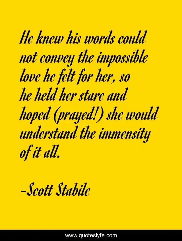 This page presents the quote "He knew his words could not convey the impossible love he felt for her, so he held her stare and hoped (prayed!) she would understand the immensity of it all.". Author of this quote is Scott Stabile. This quote is about relationships, love, pray, hope, words, affection,.