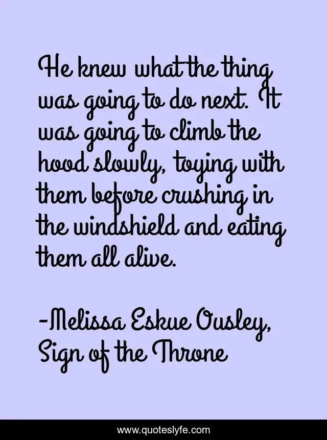 This page presents the quote "He knew what the thing was going to do next. It was going to climb the hood slowly, toying with them before crushing in the windshield and eating them all alive.". Author of this quote is Melissa Eskue Ousley, Sign of the Throne. This quote is about fantasy, young-adult, paranormal,.
