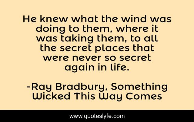 This page presents the quote "He knew what the wind was doing to them, where it was taking them, to all the secret places that were never so secret again in life.". Author of this quote is Ray Bradbury, Something Wicked This Way Comes. This quote is about childhood, old-age,.