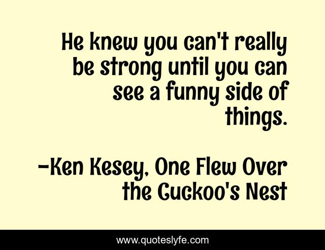 This page presents the quote "He knew you can't really be strong until you can see a funny side of things.". Author of this quote is Ken Kesey, One Flew Over the Cuckoo's Nest. This quote is about strength-and-courage, strong, inspiration,.