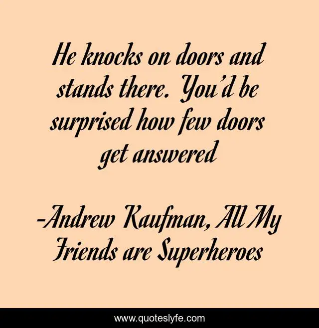 This page presents the quote "He knocks on doors and stands there. You’d be surprised how few doors get answered". Author of this quote is Andrew Kaufman, All My Friends are Superheroes. .