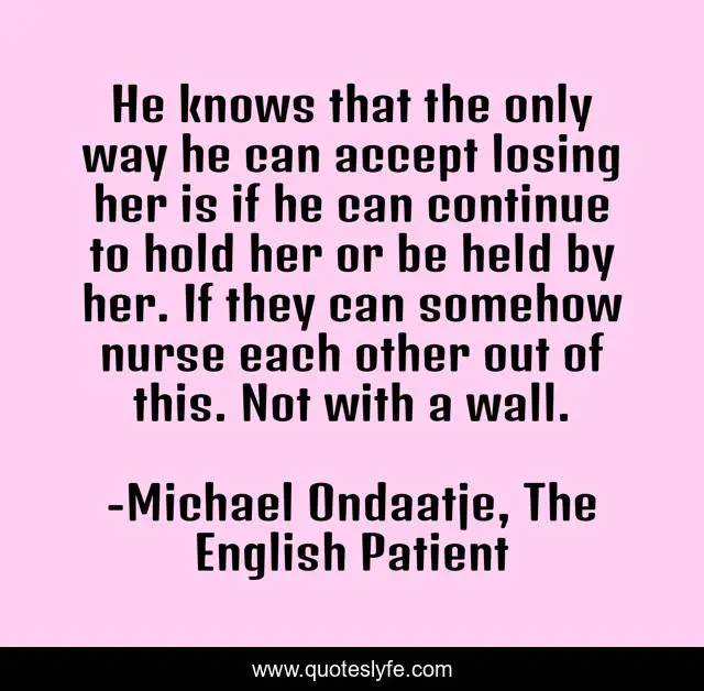 This page presents the quote "He knows that the only way he can accept losing her is if he can continue to hold her or be held by her. If they can somehow nurse each other out of this. Not with a wall.". Author of this quote is Michael Ondaatje, The English Patient. This quote is about loss, love, affection,.