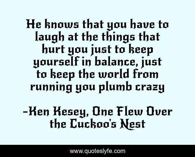 This page presents the quote "He knows that you have to laugh at the things that hurt you just to keep yourself in balance, just to keep the world from running you plumb crazy". Author of this quote is Ken Kesey, One Flew Over the Cuckoo's Nest. This quote is about crazy, mental-health, laughter, mental-illness,.