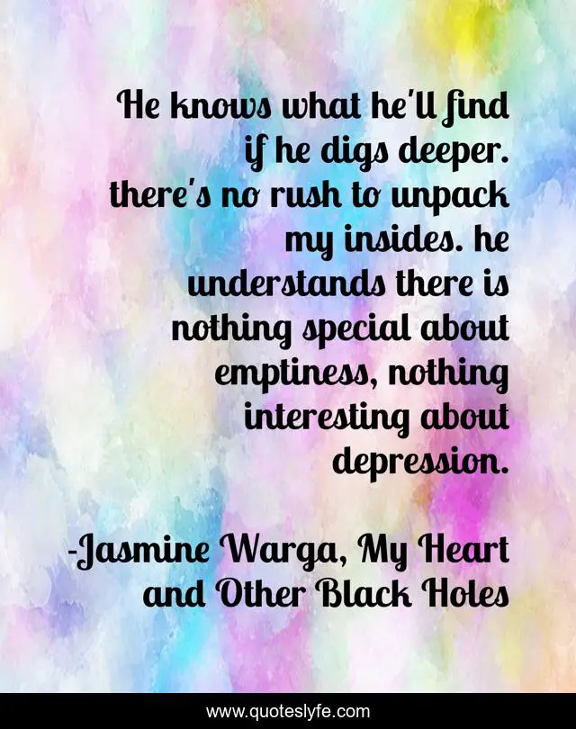 This page presents the quote "He knows what he'll find if he digs deeper. there's no rush to unpack my insides. he understands there is nothing special about emptiness, nothing interesting about depression.". Author of this quote is Jasmine Warga, My Heart and Other Black Holes. This quote is about life, emptiness, sadness, depression, hollow,.