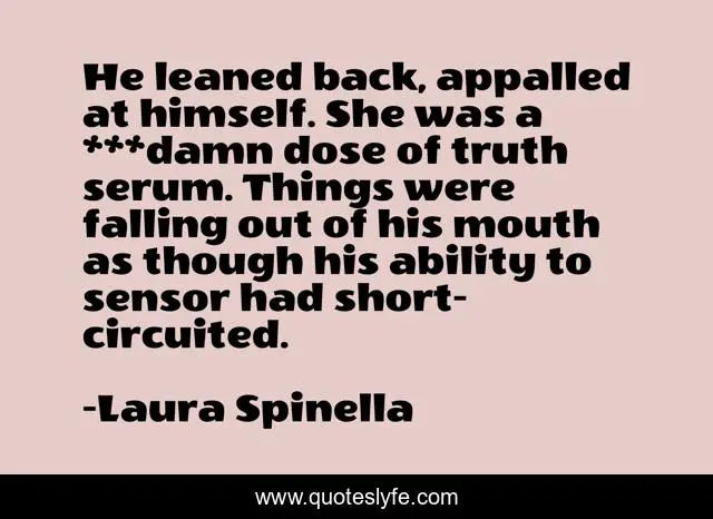 This page presents the quote "He leaned back, appalled at himself. She was a ***damn dose of truth serum. Things were falling out of his mouth as though his ability to sensor had short-circuited.". Author of this quote is Laura Spinella. This quote is about mia, flynn, truth,.