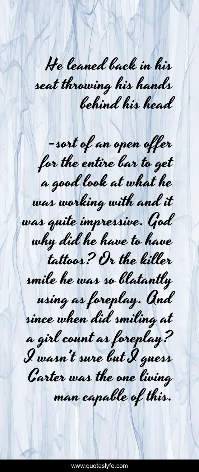 "sort of an open offer for the entire bar to get a good look at what he was working with and it was quite impressive. God why did he have to have tattoos? Or the killer smile he was so blatantly using as foreplay. And since when did smiling at a girl count as foreplay? I wasn't sure but I guess Carter was the one living man capable of this. Quotes." Quoteslyfe.com, 2025. Fri. 05 Dec. 2025. <https://www.quoteslyfe.com/quote/He-leaned-back-in-his-seat-throwing-214359>.