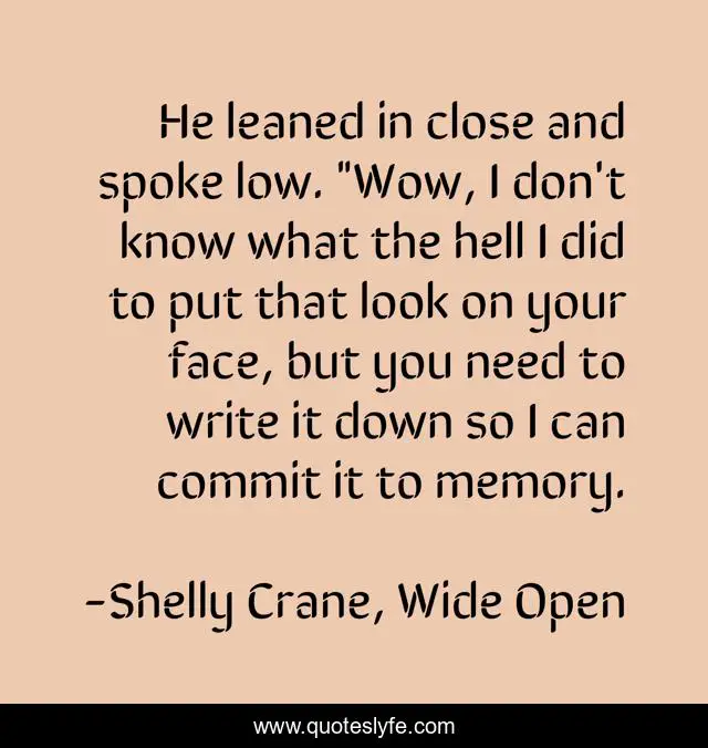 This page presents the quote "He leaned in close and spoke low. "Wow, I don't know what the hell I did to put that look on your face, but you need to write it down so I can commit it to memory.". Author of this quote is Shelly Crane, Wide Open. This quote is about true-love, young-love, young-adult,.