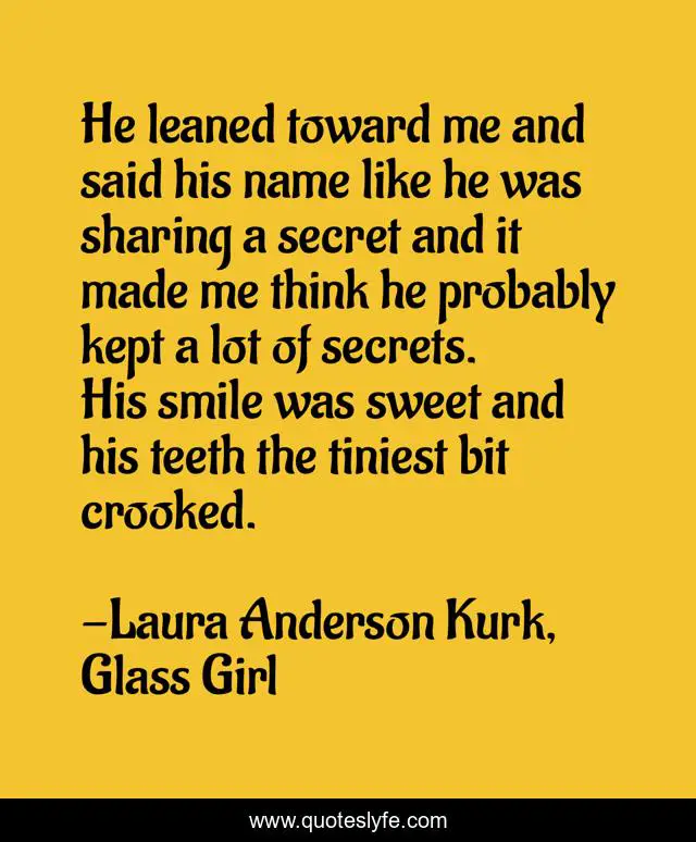 This page presents the quote "He leaned toward me and said his name like he was sharing a secret and it made me think he probably kept a lot of secrets. His smile was sweet and his teeth the tiniest bit crooked.". Author of this quote is Laura Anderson Kurk, Glass Girl. This quote is about glass-girl, love, secrets, meg-kavanagh, attraction, henry-whitmire, dating, affection,.