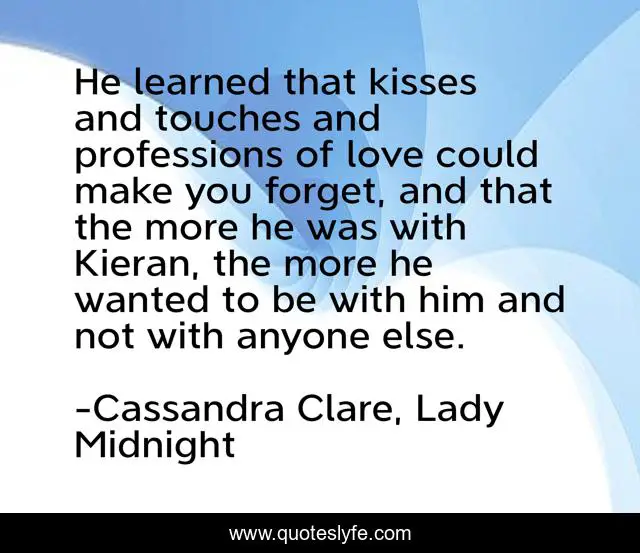 This page presents the quote "He learned that kisses and touches and professions of love could make you forget, and that the more he was with Kieran, the more he wanted to be with him and not with anyone else.". Author of this quote is Cassandra Clare, Lady Midnight. This quote is about kieran, mark-blackthorn, pain, love, faeries, pain-in-love, affection,.