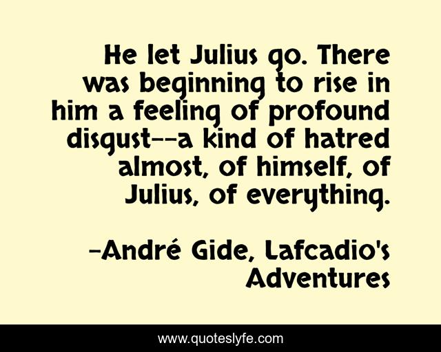 This page presents the quote "He let Julius go. There was beginning to rise in him a feeling of profound disgust--a kind of hatred almost, of himself, of Julius, of everything.". Author of this quote is André Gide, Lafcadio's Adventures. This quote is about hatred, disgust,.