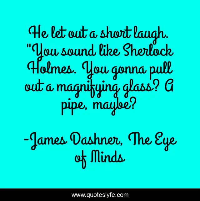 This page presents the quote "He let out a short laugh. "You sound like Sherlock Holmes. You gonna pull out a magnifying glass? A pipe, maybe?". Author of this quote is James Dashner, The Eye of Minds. This quote is about james-dasher, the-mortality-doctrine, the-eye-of-minds, science-fiction,.