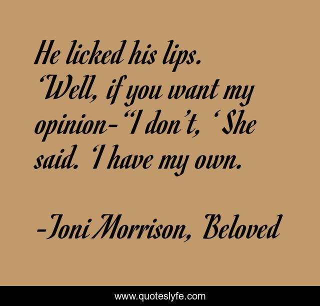This page presents the quote "He licked his lips. ‘Well, if you want my opinion-‘‘I don’t, ‘ She said. ‘I have my own.". Author of this quote is Toni Morrison, Beloved. This quote is about opinion, thoughtful, self-belief,.
