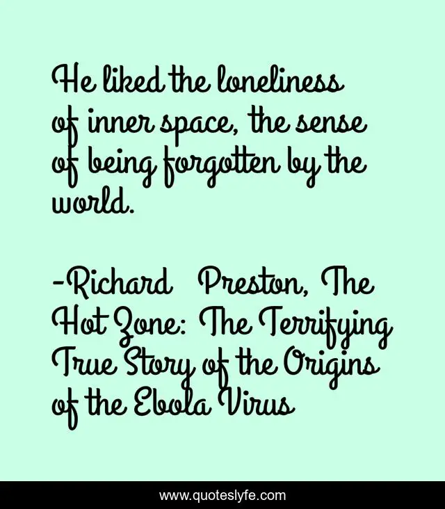 This page presents the quote "He liked the loneliness of inner space, the sense of being forgotten by the world.". Author of this quote is Richard Preston, The Hot Zone: The Terrifying True Story of the Origins of the Ebola Virus. This quote is about solitude, 125,.
