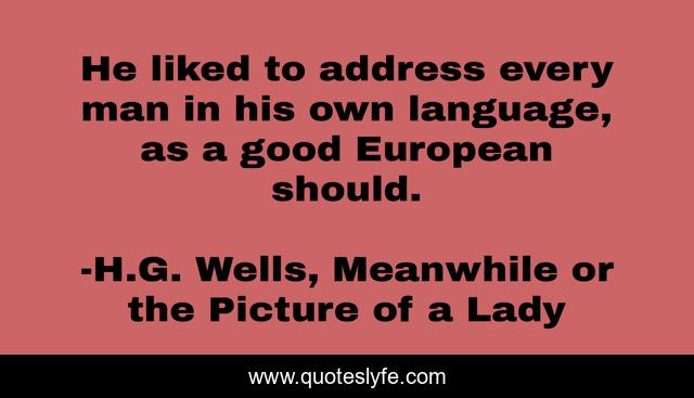 This page presents the quote "He liked to address every man in his own language, as a good European should.". Author of this quote is H.G. Wells, Meanwhile or the Picture of a Lady. This quote is about language, europeans,.