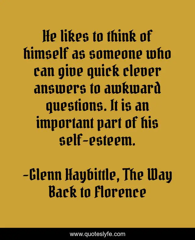 This page presents the quote "He likes to think of himself as someone who can give quick clever answers to awkward questions. It is an important part of his self-esteem.". Author of this quote is Glenn Haybittle, The Way Back to Florence. .