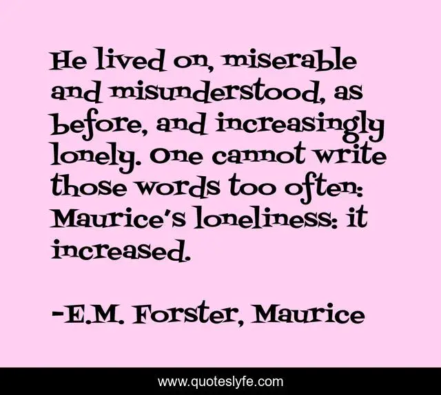 This page presents the quote "He lived on, miserable and misunderstood, as before, and increasingly lonely. One cannot write those words too often: Maurice’s loneliness: it increased.". Author of this quote is E.M. Forster, Maurice. .