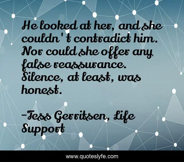 This page presents the quote "He looked at her, and she couldn't contradict him. Nor could she offer any false reassurance. Silence, at least, was honest.". Author of this quote is Tess Gerritsen, Life Support. This quote is about silence, honest,.