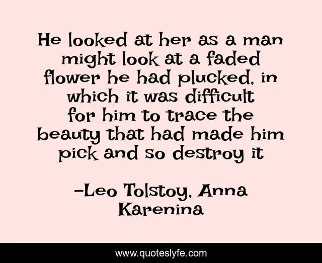 This page presents the quote "He looked at her as a man might look at a faded flower he had plucked, in which it was difficult for him to trace the beauty that had made him pick and so destroy it". Author of this quote is Leo Tolstoy, Anna Karenina. This quote is about love, anna-karenina, leo-tolstoy, sadness, despair, affection,.