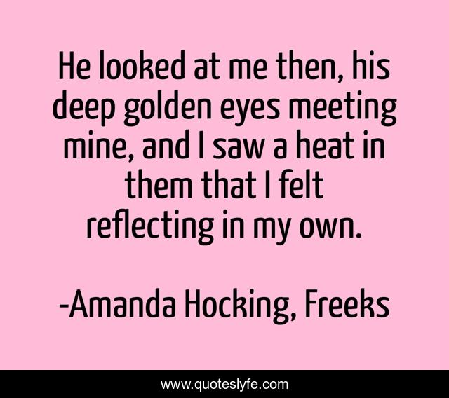 This page presents the quote "He looked at me then, his deep golden eyes meeting mine, and I saw a heat in them that I felt reflecting in my own.". Author of this quote is Amanda Hocking, Freeks. This quote is about young-adult, paranormal, carnival,.