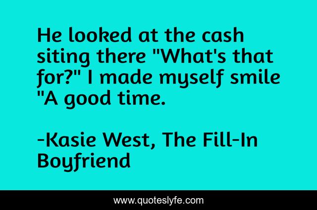 This page presents the quote "He looked at the cash siting there "What's that for?" I made myself smile "A good time.". Author of this quote is Kasie West, The Fill-In Boyfriend. This quote is about cute, comedy, funny,.