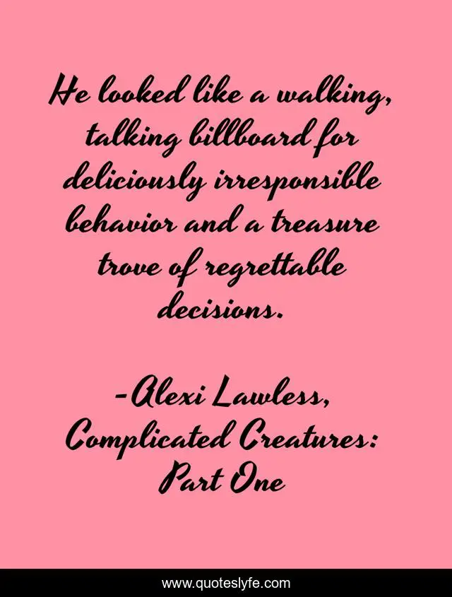 This page presents the quote "He looked like a walking, talking billboard for deliciously irresponsible behavior and a treasure trove of regrettable decisions.". Author of this quote is Alexi Lawless, Complicated Creatures: Part One. This quote is about audacious-men, romance, love, affection, decisions,.