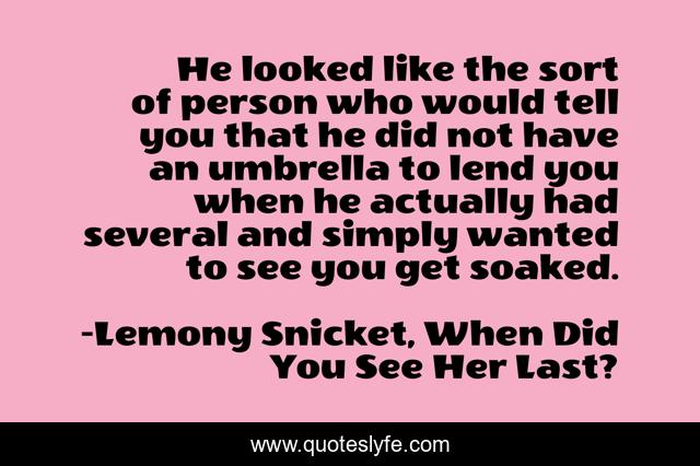 This page presents the quote "He looked like the sort of person who would tell you that he did not have an umbrella to lend you when he actually had several and simply wanted to see you get soaked.". Author of this quote is Lemony Snicket, When Did You See Her Last?. This quote is about rain, nasty, snicket, umbrellas,.