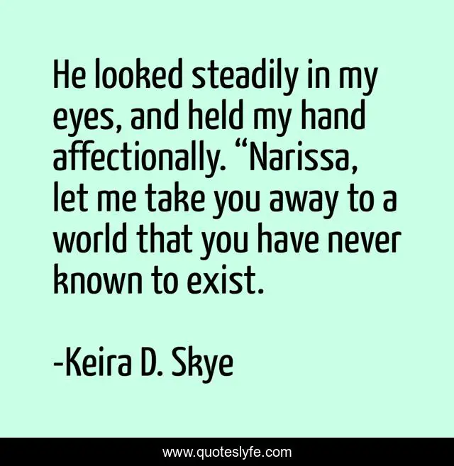This page presents the quote "He looked steadily in my eyes, and held my hand affectionally. “Narissa, let me take you away to a world that you have never known to exist.". Author of this quote is Keira D. Skye. This quote is about young-adult-suspense, shark, fish, ocean, romance, young-adult-fiction, supernatural, merman, mermaid,.