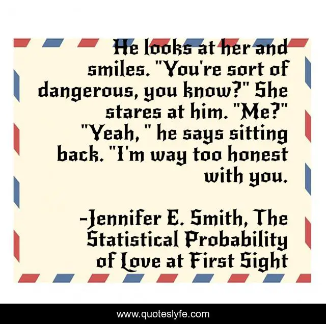 This page presents the quote "He looks at her and smiles. "You're sort of dangerous, you know?" She stares at him. "Me?" "Yeah, " he says sitting back. "I'm way too honest with you.". Author of this quote is Jennifer E. Smith, The Statistical Probability of Love at First Sight. This quote is about connection, love, affection,.