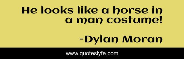 This page presents the quote "He looks like a horse in a man costume!". Author of this quote is Dylan Moran. This quote is about dylan-moran, horse, funny, british-comedy, british, black-books, comedy, man,.