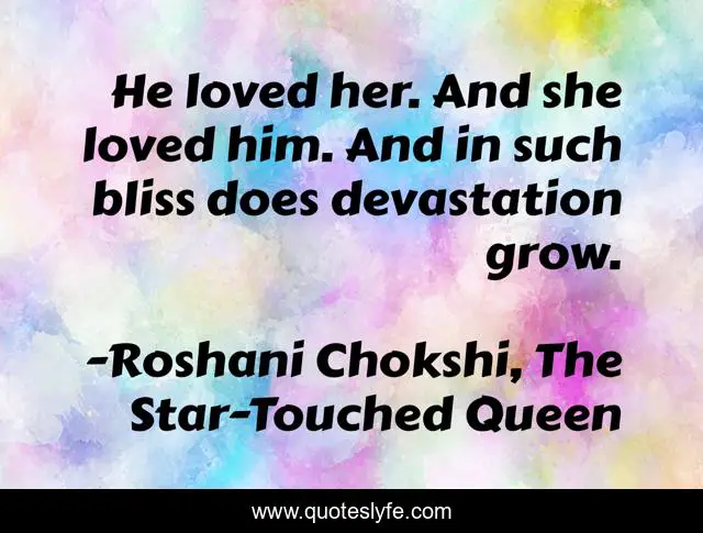 This page presents the quote "He loved her. And she loved him. And in such bliss does devastation grow.". Author of this quote is Roshani Chokshi, The Star-Touched Queen. This quote is about sadness, love, lost-love, affection, ending,.