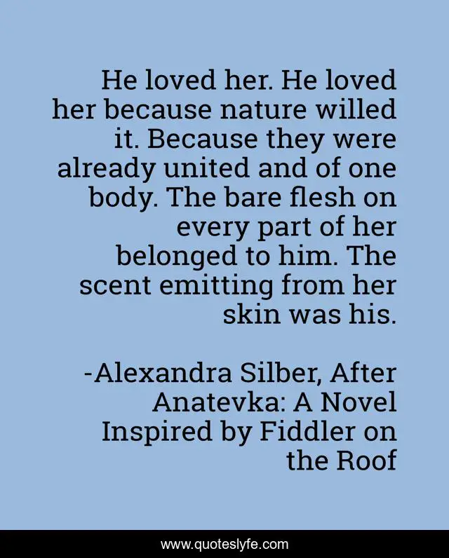 This page presents the quote "He loved her. He loved her because nature willed it. Because they were already united and of one body. The bare flesh on every part of her belonged to him. The scent emitting from her skin was his.". Author of this quote is Alexandra Silber, After Anatevka: A Novel Inspired by Fiddler on the Roof. This quote is about lust, love, marriage, affection,.