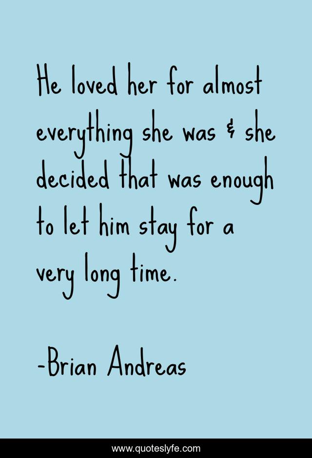 This page presents the quote "He loved her for almost everything she was & she decided that was enough to let him stay for a very long time.". Author of this quote is Brian Andreas. This quote is about relationships, adoration, love, story-people, affection,.