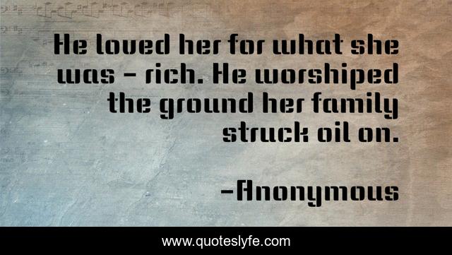 This page presents the quote "He loved her for what she was - rich. He worshiped the ground her family struck oil on.". Author of this quote is Anonymous. This quote is about love, marriage, affection,.