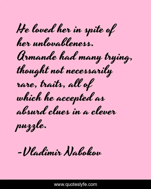 This page presents the quote "He loved her in spite of her unlovableness. Armande had many trying, thought not necessarily rare, traits, all of which he accepted as absurd clues in a clever puzzle.". Author of this quote is Vladimir Nabokov. This quote is about stupid, love, romantic, smitten, acceptance, object-of-desire, unloveable, lovestruck, obsession,.