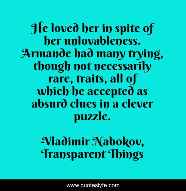 This page presents the quote "He loved her in spite of her unlovableness. Armande had many trying, though not necessarily rare, traits, all of which he accepted as absurd clues in a clever puzzle.". Author of this quote is Vladimir Nabokov, Transparent Things. This quote is about love, romantic, obsessed, smitten, object-of-desire, stupid, lovestruck, blinded, affection,.