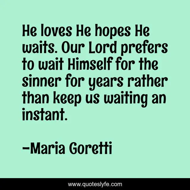 This page presents the quote "He loves He hopes He waits. Our Lord prefers to wait Himself for the sinner for years rather than keep us waiting an instant.". Author of this quote is Maria Goretti. .