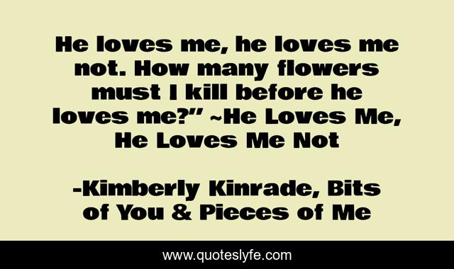This page presents the quote "He loves me, he loves me not. How many flowers must I kill before he loves me?” ~He Loves Me, He Loves Me Not". Author of this quote is Kimberly Kinrade, Bits of You & Pieces of Me. This quote is about memoir, poetry,.